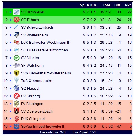 Durch den 4:1-Heimerfolg klettert die DJK Ballweiler-Wecklingen II mit nunmehr 16 Zählern auf Rang fünf der Tabelle, Oberwürzbach steht mit vier Zählern auf dem drittletzten Tabellenplatz.