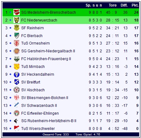 Durch den knappen aber wichtigen Auswärtssieg bleibt die SG Medelsheim-Brenschelbach mit 24 Punkten der Spitzenreiter der Kreisliga A Bliestal, die SG Rubenheim—Herbitzheim-Bliesdalheim II steht mit mageren vier Punkten auf dem vorletzten Tabellenplatz.