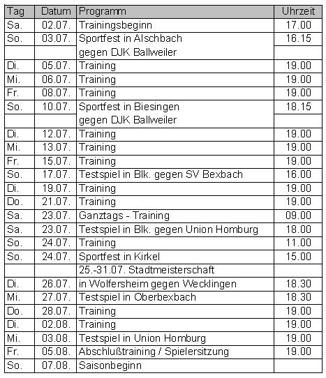 Änderung: Ein weiterer Termin kommt hinzu: Am 28. Juli 2005 um 18:00 Uhr spielt der SCB auf dem Sportfest der DJK Ballweiler gegen den FV Biesingen