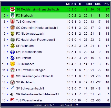 Durch den Sieg konnte die SG Medelsheim-Brenschelbach ihren Vorsprung an der Tabellenspitze auf sieben Zähler ausbauen und steht nun mit 27 Punkten vor den Zweitplatzierten aus Bierbach. Der FC Erfweiler-Ehlingen steht mit 10 Punkten auf Rang 11 der Tabelle.