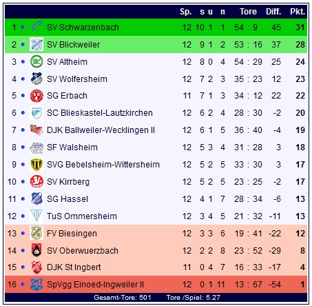 Durch den Sieg bleibt der SV Blickweiler auf Rang zwei mit 28 Punkten und drei Punkten Rückstand auf Schwarzenbach im Titelrennen. Wolfersheim steht mit 23 Punkten auf Tabellenplatz vier.