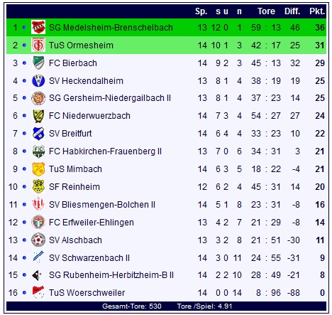 Durch den wichtigen Auswärtssieg bleibt der TuS Ormesheim mit 31 Punkten auf Rang zwei der Tabelle, die Verbandsliga-Reserve des SV Bliesmengen-Bolchen steht mit 16 Punkten auf Rang elf des Klassements.