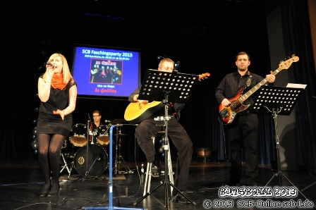 Nach dem „Pausentee“ ging es gleich mit einem echten Bimsball-Klassiker weiter: Die Zwei vun de Bank alias Horst Klein und Kurt Colett sorgten für ein echtes Lacher-Feuerwerk mit den gewohnten Seitenhieben zu der gesamten SC-Prominenz. Zur musikalischen Anmoderation „Monsta“ (Culcha Candela), ließ die Frau mit dem „Monsta Body“ Ursel (Kurt Collet) nicht lange auf sich warten und brachte die Moderatoren und das Publikum ins Schwitzen. Etwas glamouröser wirkte der Auftritt von Renate (Horst Klein), die neben ihrer Freundin Ursel Platz auf der Bank nahm. Und so begann wie in den vergangenen Jahren der Klatsch und Tratsch, der wie immer kein Auge trocken ließ, ehe Se Gollies alias Christian Feller, Anne Hartmann, Marco Hartmann, Sebastian Kiefer, Sebastian Kohl und Günter Pusse die Halle in gewohnt lässiger Manier mit Partyhits und Klassikern versorgten. Auch Blieskastels Partyband Nr. 1 ist mittlerweile ein fester Bestandteil des Bimsball. Die Band um Chrsitian Feller, Anne Hartmann, Marco Hartmann, Sebastian Kiefer, Sebastian Kohl und Günter Pusse sorten mit den Hits „Der Bofrost-Mann (Die Toten Hosen)“, „A night like this (Caro Emerald)“, „Candy (Robbie Williams)“, „I follow rivers (Triggerfinger feat. Lykke Li)“, Gimme hope Joana (Eddy Grant)“, „Rockin all over the world (Status Quo)“, für Partystimmung in der Festhalle.