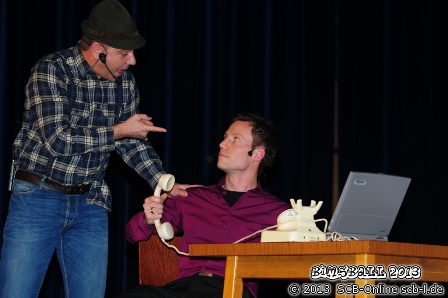 Es folgte eine kurzweilige Tanzeinlage des BKG-Männerballetts, das erstmals beim SC-Bimsball am Start war, bestehend aus Christian Centawer, Ralf Friesenhahn, Patrick Haas, Klaus Hennrich, Christian Pöbl, Markus Roth, Michael Schreiner und Christian Utfeld ehe die SCler in Person von Matthias Schößer und Horst „Schnippi“ Klein mit einem kurzes Sketch die Lachmuskeln der Anwesenden strapazierten. Im German Employment Center fühlte sich der Arbeitssuchene Herr Schnippinsky (Horst Klein) gar nicht wohl. Erst war sein alter Sachbearbeiter verschwunden, dann wollte ihm sein neuer Sachbearbeiter (Matthias Schößer) einen neumodischen Job als Infobroker, Webmaster, Eventmanager, Application Engineer oder Call Dispatcher verschaffen – was letztlich an den Anforderungen scheiterte – und zu allem Überfluss sollte er sich am Ende noch headhuntern lassen?! Nein! Er bevorzugt zunächst mal einen Englischkurs an der Volkshochschule. Doch viel lieber wäre im sein alter Sachbearbeiter. Der gibt ihm zwar auch keine Arbeit, aber spricht wenigstens seine Sprache.