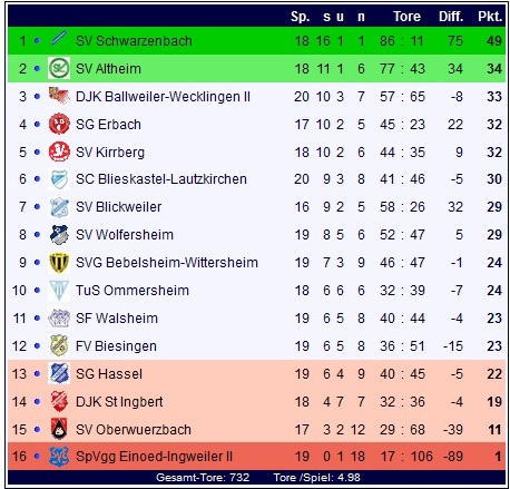 Durch den wichtigen Derby-Sieg steht die SG Hassel mit 22 Punkten auf dem potentiellen Abstiegsrang 13 hat den Abstand zu Biesingen und Walsheim aber auf einen Punkt zusammenschmelzen lassen. Oberwürzbach steht mit 11 Punkten auf Rang 15 und muss um den Klassenverbleib mehr denn je zittern.