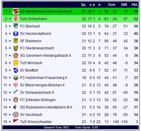 Ein Blick auf die gesammelten Ergebnisse des Nachholspieltages des 18ten Spieltages zeigt Siege von Medelsheim-Brenschelbach und Ormesheim. Bierbach dagegen strauchelt und muss das Führungsduo vorerst ziehen lassen: