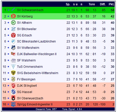 Durch den hart erkämpften 3:1-Auswärtssieg in Ommersheim steht der SV Schwarzenbach mit 58 Punkten und 98:13 Toren an der Spitze der Tabelle und hat 16 Punkte Vorsprung auf den ärgsten Verfolger, der nun aus Kirrberg kommt. Der TuS Ommersheim steht mit 30 Punkten auf Tabellenplatz zehn.