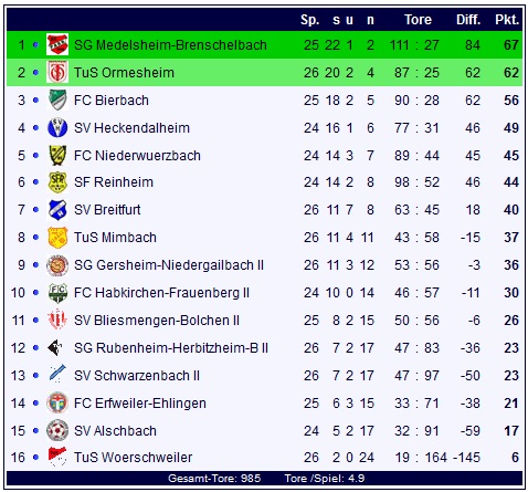 Durch den knappen Auswärtssieg steht der TuS Ormesheim mit 62 Punkten auf Rang zwei und macht Punkte zur fünf Punkten entfernten Spitze gut. Der TuS Mimbach rangiert mit 37 Punkten auf Rang acht der Tabelle.