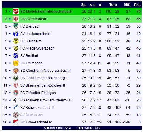 Durch den 4:1-Sieg im Spitzenspiel baut die SG Medelsheim-Brenschelbach ihr Punktekonto auf 70 Zähler aus und straft alles „Nervenflattern-Gerede“ nach der Niederlage in Heckendalheim Lügen. Zwei Siege in den ausstehenden vier Spielen genügen der SG nun zum Titelgewinn. Der FC verliert im Kampf um Rang zwei weiter an Boden und liegt neun Punkte hinter dem TuS Ormesheim. Auch wenn noch ein BFC-Nachholspiel aussteht muss man schon auf einen herben Ormesheimer Aussetzer hoffen um noch auf den Relegationsrang hoffen zu dürfen.