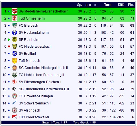 Ein Blick auf die gesammelten Ergebnisse des 30sten und letzten Spieltages zeigt Siege für Bierbach und Ormesheim, was den TuS im Fernduell um Relegationsrang zwei Jubeln lässt: