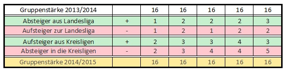 Die Zahl der Absteiger in der Landesliga hängt von drei Faktoren ab: Zum Einen von der Zahl der Verbandsliga-Absteiger, zum Anderen davon ob der eigene Tabellenzweite den Aufstieg in die jeweilige Verbandsliga realisieren kann und natürlich davon wie viele Vereine aus den Bezirksligen in die jeweilige Landesliga aufsteigen. Auch ist zu erkennen, wann die Landesligen aufgestockt würden: