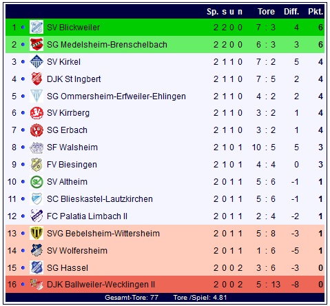 Auch nach dem zweiten Spieltag ist die Tabelle noch nicht vollends aussagekräftig, dennoch wird das Bild, das sie zeigt nun von Spieltag zu Spieltag klarer: Die Überraschungen kommen bisher vor allem von den beiden Aufsteigern aus Medelsheim-Brenschelbach und Kirkel, die die Plätze zwei und drei belegen: