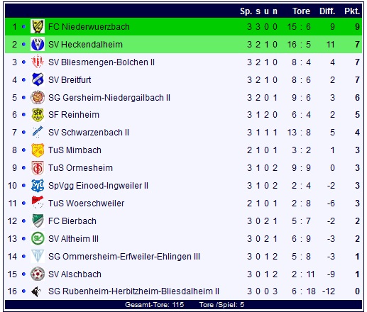 In der Tabelle wird das Bild immer klarer: Niederwürzbach steht vor Heckendalheim an der Spitze, die SG Rubenheim-Herbitzheim-Bliesdalheim steht punktlos am Ende der Tabelle: