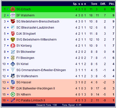 Einen deutlichen Auswärtserfolg gab es am Ende für die SG Erbach, die mit 5:0 bei der Verbandsliga-Reserve aus Limbach gewinnen konnte. Erbach übernimmt damit mit 10 Punkten als einziges ungeschlagenes Team der Liga die Tabellenspitze, Limbach ist neben Altheim das einzige sieglose Team der Liga und steht auf Tabellenplatz 16 am Tabellenende.