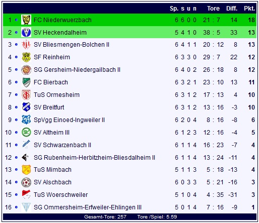Erneut in Torlaune zeigte sich am Ende der SV Heckendalheim, der auf eigenem Platz mit 10:0 gegen die Reserve des Landesligisten aus Einöd-Ingweiler setzen konnte. Der SVH schiebt sich damit mit einem Nachholspiel im Rücken mit 13 Punkten auf Rang zwei der Tabelle, Einöd-Ingweiler II rangiert mit sechs Zählern auf Tabellenplatz neun.