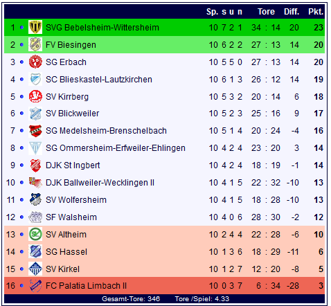 In der Tabelle der Bezirksliga Homburg steht die SVG Bebelsheim-Wittersheim mit 23 Punkten an der Spitze, die Reserve der Palatia aus Limbach bleibt das sieglose Schlusslicht: