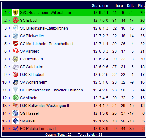 Durch den 6:1-Auswärtssieg schieben sich die Sportfreunde aus Walsheim mit 18 Punkten auf Rang acht der Tabelle, Limbach bleibt ohne Sieg mit drei Punkten auf Rang 16 der Tabelle und es droht der zweite Abstieg in Folge für die Palatia-Reserve.