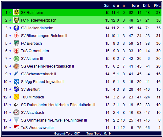 Mit 6:0 gewinnen die Sportfreunde aus Reinheim auf eigenem Platz gegen den SV Alschbach und schieben sich damit mit 37 Punkten an die Tabellenspitze, kann aber von Heckendalheim bei deren Nachholspiel gegen Wörschweiler noch überholt werden. Alschbach steht mit 10 Punkten auf Rang 14 der Tabelle.