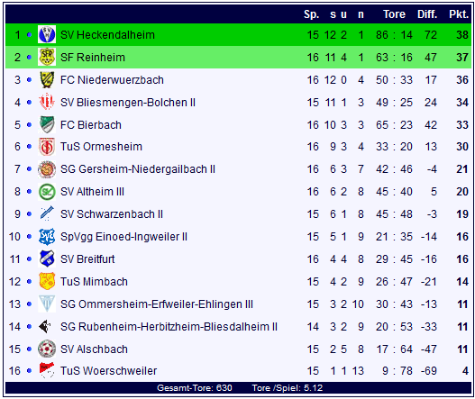 Damit ist der erste Rückrundenspieltag beendet und vor allem die Spitzenspiele bringen einiges an Erkenntnis: Reinheim, Niederwürzbach und Ormesheim heißen die Verlierer der Spitzenspiele, Bliesmengen-Bolchen II, Bierbach und Heckendalheim die zugehörigen Sieger: