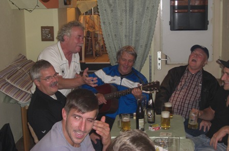 Mittlerweile schon legendär war der berühmte Treff vom 9.Oktober 2013 in Bernd´s Bitburger Stube, dem Lokal, in dem 2012 alles einmal begann, wo sich aus einem lockeren und zunächst ruhigen Beginn plötzlich eine Stimmung entfachte, die es so bei einem Expertentreff wohl noch nicht gab: Gitarrist und Experte Walter „Hase“ Reinhard, der mittlerweile bekanntlich ja immer erst nach seinem AH-Training gegen 20 Uhr eintrifft schnappte sich die in der Kneipe Richtung Toiletten hängende und erstaunlicherweise noch recht gut gestimmten Gitarre und gab seine Lieblingshits zum Besten.