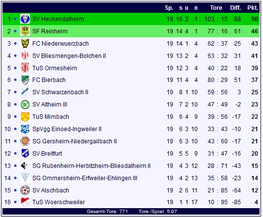 In der Tabelle der Kreisliga A Bliestal ändert sich wenig nur die Sportfreunde aus Reinheim können sich etwas im Kampf um Platz zwei absetzen und distanzieren den FC Niederwürzbach auf drei Punkte: