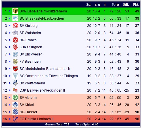 Am Ende teilen sich der Spitzenreiter der SVG Bebelsheim-Wittersheim und der Tabellenzweite des SV Kirrberg also mit einem 1:1-Remis die Punkte. Die SVG bleibt durch das Remis mit 49 Punkten und 79:26 Toren Spitzenreiter der Bezirksliga Homburg, der SV Kirrberg fällt mit 37 Punkten auf Rang drei zurück und wird vom SC Blieskastel-Lautzkirchen überholt, der sich mit 38 Punkten auf Rang zwei niederlässt.