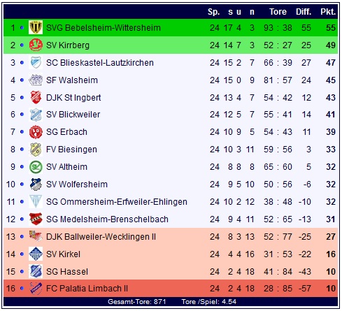 Durch den 3:2-Auswärtssieg in Kirkel kann sich der SV Kirrberg Rang zwei vom SC Blieskastel-Lautzkirchen zurück erobern und hat nun 49 Punkte auf dem Konto. Der SV Kirkel bleibt wie alles anderen Teams auf den letzten drei Plätzen ohne Punkte und steht mit 16 Punkten weiter auf Rang 14.