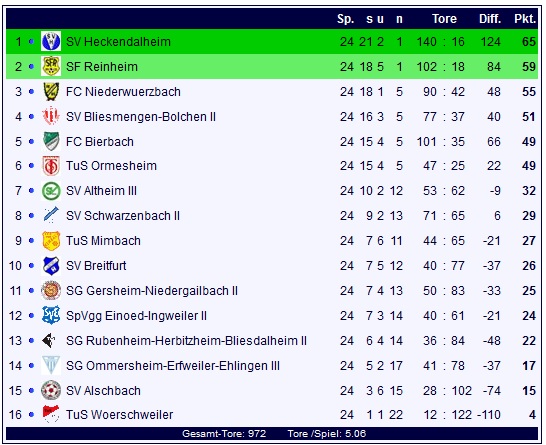 Am Ende gewinnen die Sportfreunde aus Reinheim mit 4:0 bei der SG Ommersheim-Erfweiler-Ehlingen III und bleiben damit mit 59 Punkten der ärgste SVH-Verfolger. Die SG steht mit 17 Punkten und 41:77 Toren auf dem Drittletzten Tabellenplatz.