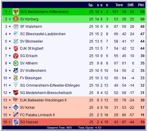 Durch das 1:1-Remis gegen die Palatia-Reserve aus Limbach bleibt der SV Kirrberg mit nunmehr 50 Punkten zwar auf Relegationsrang zwei, steht nun aber wieder acht Punkte hinter dem Klassenprimus aus Bebelsheim-Wittersheim. Limbach II schiebt sich mit nunmehr 11 Punkten zumindest den letzten Platz verlassen und sich auf Rang 15 nach vorne schieben.