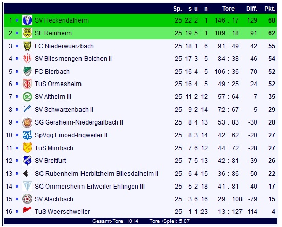 Komplettiert wurde der 25ste Spieltag durch das Gastspiel des TuS Mimbach bei den Sportfreunden aus Reinheim. Reinheim untermauerte vor Wochenfrist seinen Anspruch auf Relegationsrang zwei durch einen 4:0-Auswärtssieg bei der SG Ommersheim-Erfweiler-Ehlingen III. Der TuS Mimbach dagegen kam auf eigenem Platz zu einem torlosen Remis gegen die Reserve des SV Schwarzenbach. Nun wollte Reinheim auf der Erfolgsspur bleiben und einen weiteren Schritt in Richtung Relegation gehen, während Mimbach sicherlich den Spielverderber spielen wollte.