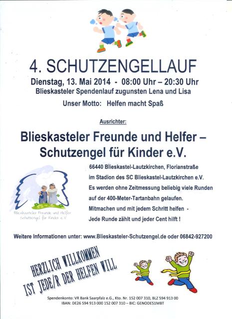 Über 1000 Läufer aller Altersklassen machten in Vorjahren mit nun geht der Schutzengellauf beim SC in die mittlerweile schon vierte Runde. "Spaß an der Bewegung haben und dabei etwas Gutes tun" – das ist die zentrale Idee des Schutzengellaufs, den Blieskastler Freunde und Helfer – Schutzengel für Kinder e.V., der am Dienstag, 13. Mai 2014, von 08.30 Uhr Uhr bis 20:30 Uhr zum vierten Mal auf der Sportanlage des SC Blieskastel-Lautzkirchen e.V. veranstalten. Wie schon im Vorjahr sollen fleißig Spenden gesammelt werden und dabei etwas für die eigene Gesundheit gemacht werden.