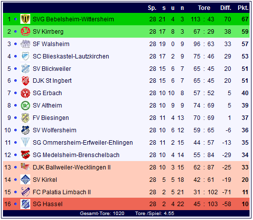 In der Tabelle der Bezirksliga Homburg ist die SVG Bebelsheim-Wittersheim an der Tabellenspitze nicht mehr einzuholen, der Kampf um Relegationsrang zwei reduziert sich auf das Duell zwischen dem SV Kirrberg und den SF Walsheim, der SC Blieskastel-Lautzkirchen muss die Konkurrenz davon ziehen lassen und schaut in die Röhre. Die Bezirksliga Homburg durchbrach am 28sten Spieltag zudem die 1000-Tore-Schallmauer:
