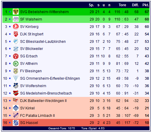 In der Tabelle der Bezirksliga Homburg stehen der SV Kirrberg und die Sportfreunde aus Walsheim nun punktgleich auf Relegationsrang zwei, der direkte Vergleich (SV Kirrberg - SF Walsheim 3:0 | 4:5) spricht aber knappt für den SVK. Die SG Hassel steigt nach einem Debakel in Walsheim in die Kreisliga A ab:
