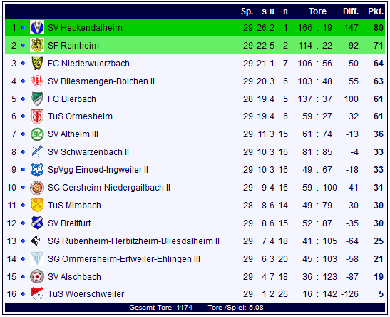 In der Tabelle der Kreisliga A Bliestal ist der SV Heckendalheim an der Spitze nicht mehr einzuholen und geht mit 80 Punkten und 166:19 Toren einen Spieltag vor dem Saisonende als verdienter Meister durchs Ziel. Die Sportfreunde aus Reinheim belohnen sich für eine ebenfalls tolle Saison mit Rang zwei der Tabelle: