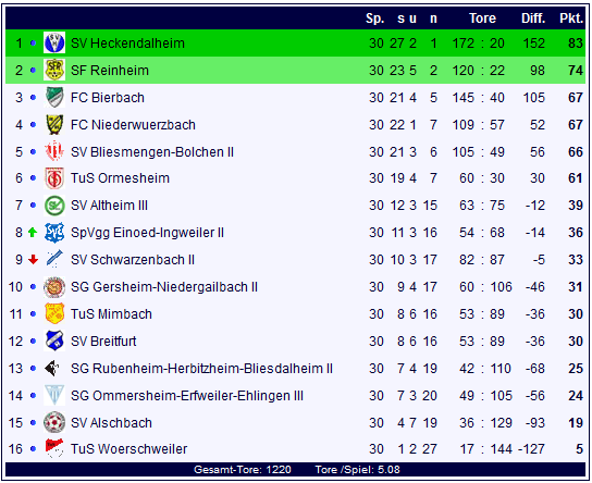 Der SV Heckendalheim strauchelte trotz Meisterfeierlichkeiten auch im letzten Spiel nicht und sicherte sich einen 6:1-Heimerfolg gegen die SG Gersheim-Niedergailbach II. Damit schließt der Meister die Saison mit 83 Punkten und 172:20 Toren ab. Die SG-Reserve dagegen steht mit 31 Punkten über Nacht auf Rang zehn der Tabelle.