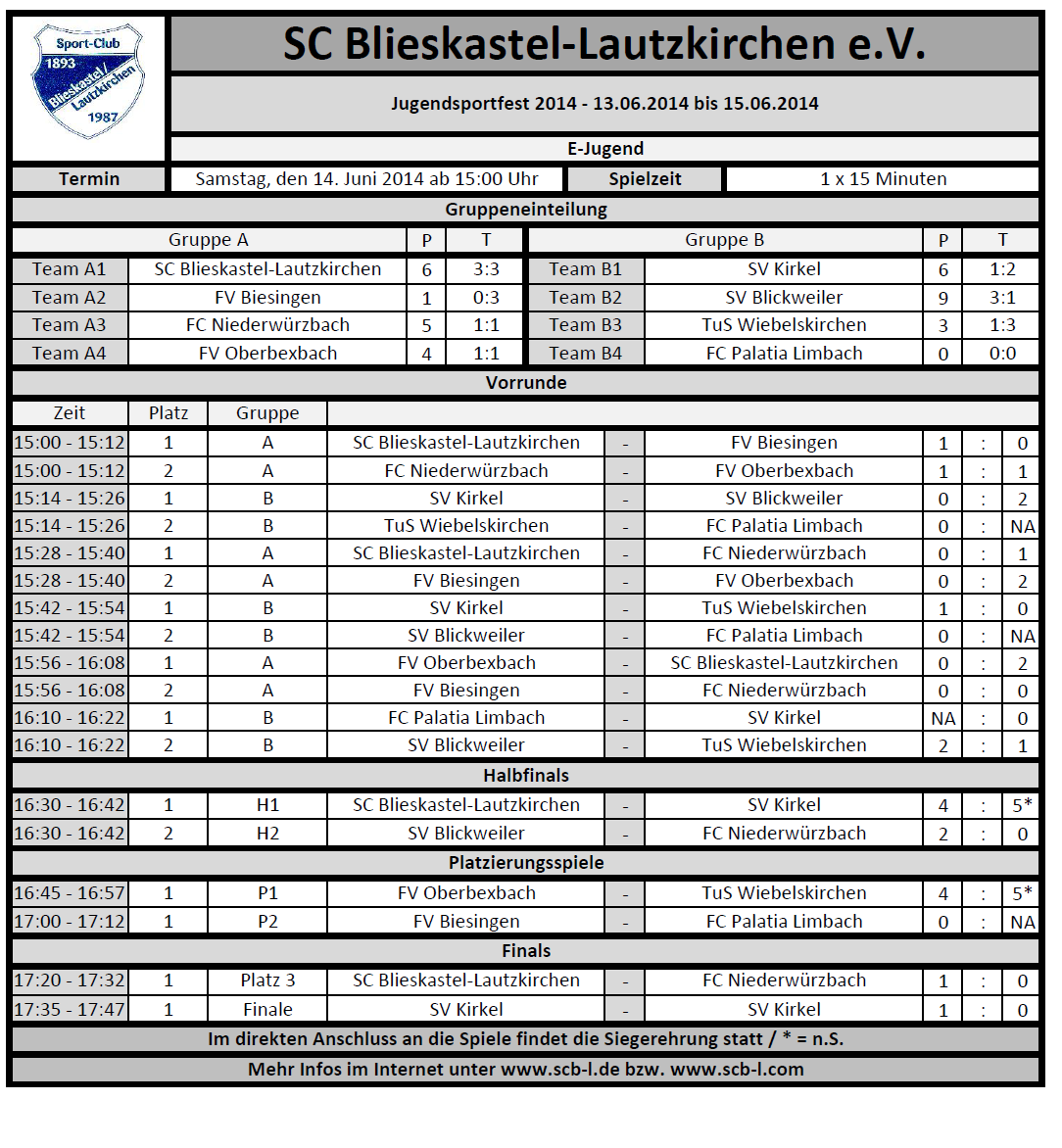 Für einen spektakulären Schlusspunkt des Tages sorgten die E-Jugenden, die den Fans ein unglaubliches Turnier boten: Der SC Blieskastel-Lautzkirchen und der FC Niederwürzbach zogen aus Gruppe A ins Halbfinale ein, der SV Kirkel und der SV Blickweiler machten in Gruppe B das Rennen. Die Halbfinals waren an Spannung kaum zu überbieten: Ein Wembley-Nicht-Tor im Elfmeterschießen des Halbfinals brachte den SV Kirkel gegen die Gastgeber aus Blieskastel-Lautzkirchen ins Finale, im zweiten Halbfinale setzte sich der SV Blickweiler durch, der auch das Finale gegen den SV Kirkel knapp für sich entscheiden konnte.
