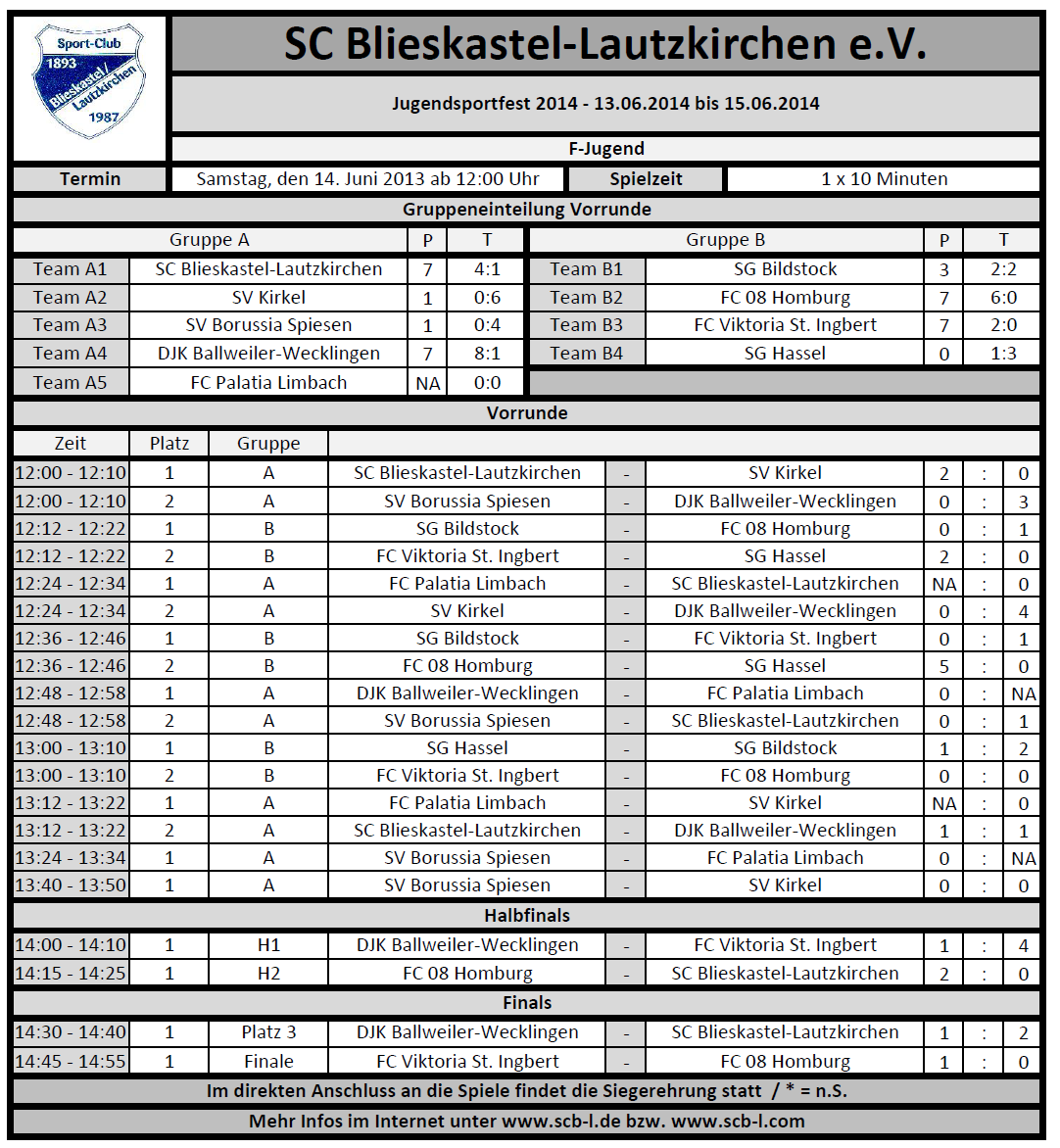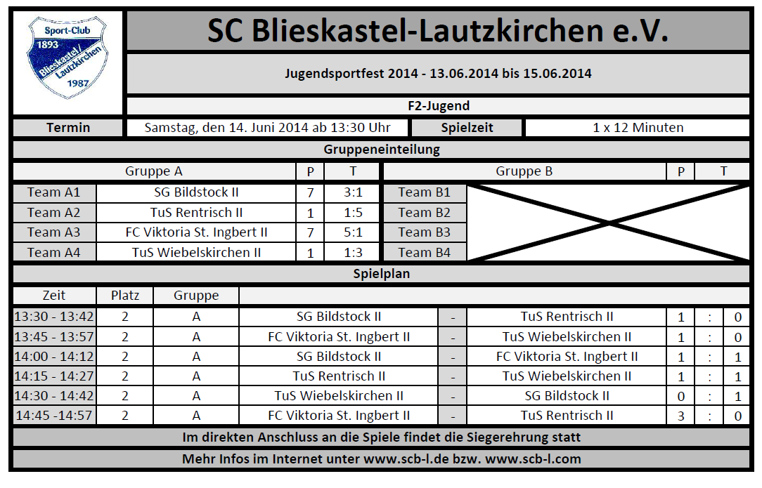Nach den G-Jugenden gingen die F1-Jugenden auf Punkte und Torejagd und in zwei Gruppen ging es mächtig rund: Der FC 08 Homburg und die Viktoria aus St. Ingbert setzten sich in Gruppe B durch, der Gastgeber des SC Blieskastel-Lautzkirchen und die DJK Ballweiler-Wecklingen in Gruppe B. Am Ende konnten sich die beiden Teams aus der Gruppe in den Halbfinals durchsetzen und standen sich im Finale erneut gegenüber. Am Ende jubelte die Viktoria aus St. Ingbert nach einem spannenden Endspiel über den Turniersieg.