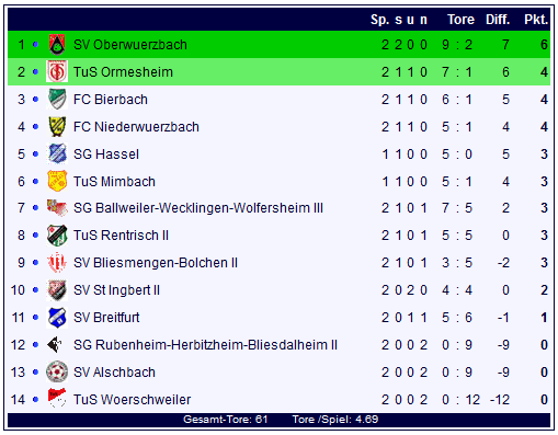 Damit gewinnt der TuS Ormesheim am Ende deutlich mit 6:0 in Alschbach und setzt sich mit vier Punkten auf Rang zwei der Tabelle, Alschbach dagegen bleibt punktlos Vorletzter der Tabelle.
