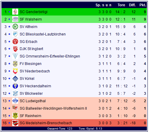 Die Tabelle der Bezirksliga Homburg gibt nach drei Spielen ein immer deutlicheres Bild: Die Sportfreunde aus Walsheim und der SV Genclerbirligi Homburg bleiben als einzige Teams ohne Verlustpunkt, die Sportfreunde aus Reinheim und die SG Medelsheim-Brenschelbach dagegen bleiben als einziges Teams ohne Punkt:
