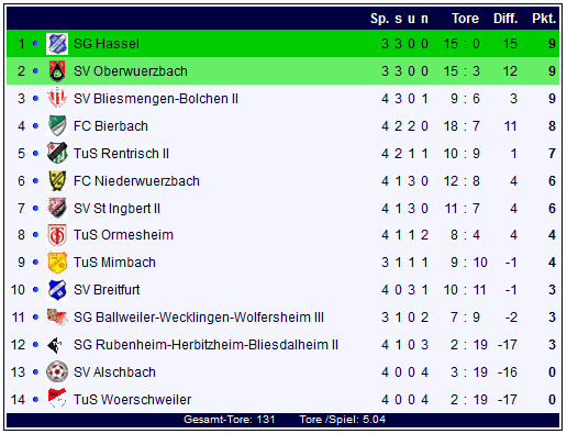 Durch den deutlichen 9:0-Heimerfolg steht die SG Hassel mit weißer Weste und neun Punkten an der Spitze der Tabelle, die SG Rubenheim-Herbitzheim-Bliesdalheim II hat mit drei Zählern Rang 12 inne.