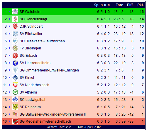 Damit steht auch die Tabelle der Bezirksliga Homburg nach dem sechsten Spieltag. Die Sportfreunde aus Reinheim rücken vor Medelsheim-Brenschelbach und Ballweiler-Wecklingen-Wolfersheim II auf den drittletzten Patz nach vorne, an der Spitze bleibt dagegen alles beim Alten: