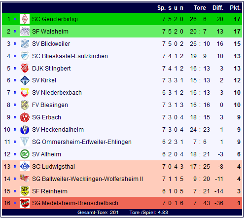 In der Tabelle der Bezirksliga Homburg stehen nun die Sportfreunde aus Walsheim und der SV Genclerbirligi Homburg mit jeweils 17 Punkten an der Spitze der Tabelle, während der SV Blickweiler mit 15 Punkten auf Rang drei in Lauerstellung ist: