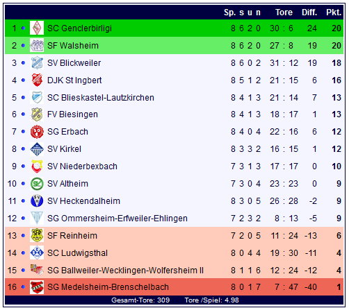 In der Tabelle der Bezirksliga Homburg teilen sich der SV Genclerbirligi Homburg und die Sportfreunde aus Walsheim mit 20 Punkten die Tabellenspitze, dahinter ist der SV Blickweiler mit 18 Punkten der einzige Verfolger in Schlagdistanz: