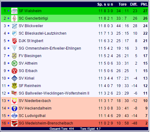 In der Tabelle muss der SV Genclerbirligi Homburg die Tabellenführung an die Sportfreunde aus Walsheim abgeben. Am Tabellenende belegen mit Niederbexbach, Heckendalheim und Ludwigsthal drei Absteiger neben dem Schlusslicht aus Medelsheim-Brenschelbach die potentiellen Abstiegsplätze: