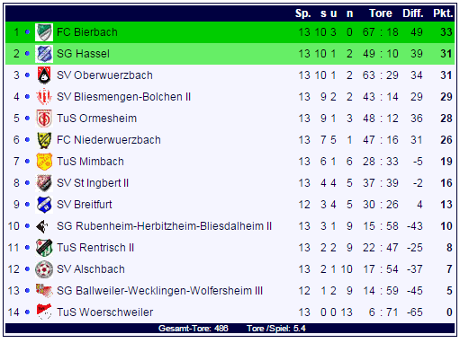 Damit ist der letzte Hinrundenspieltag gespielt und wir blicken auf die gesammelten Ergebnisse: Der FC Bierbach gewinnt das Spitzenspiel gegen den SV Oberwürzbach mit 5:2, im zweiten Spitzenspiel des Tages trennen sich die SG Hassel und der FC Niederwürzbach mit einem 1:1-Remis: