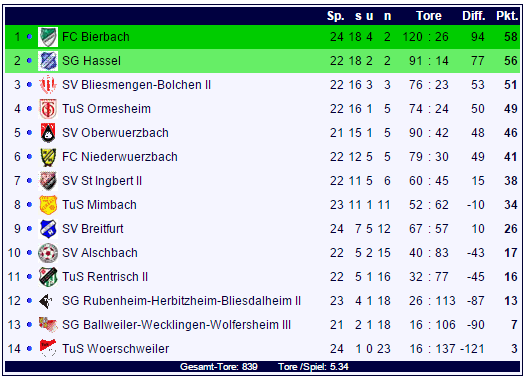 Am Ende gewinnt der FC Bierbach auf eigenem Platz mit 13:0 mehr als nur deutlich gegen den Lokalrivalen des TuS Mimbach. Der BFC steht mit 58 Punkten wieder auf Rang eins der Tabelle, hat aber zwei Spiele mehr absolviert als die zuletzt spielfreie SG Hassel mit 56 Punkten auf Rang zwei. Mimbach rangiert mit 34 Punkten auf Rang acht der Tabelle.