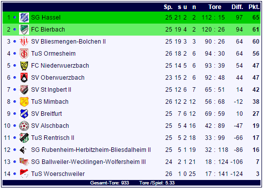 Am Ende gewinnt die SG Hassel auf eigenem Platz mit 14:0 gegen den TuS Rentrisch II und sichert sich mit 65 Punkten und 112:15 Toren vorzeitig den Meistertitel der Kreisliga A Bliestal. Der TuS Rentrisch II steht mit 17 Punkten auf dem 11ten Tabellenplatz.