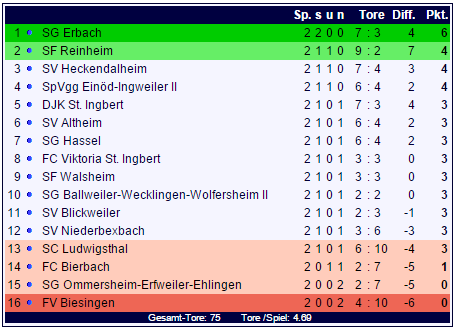 In der Tabelle der Bezirksliga Homburg steht die SG Erbach als einziges Team mit zwei Siegen an der Tabellenspitze, dahinter folgen drei ungeschlagene Teams mit vier Zählern. Nur die SG Ommersheim-Erfweiler-Ehlingen und der FV Biesingen starteten mit zwei Niederlagen in die Saison: