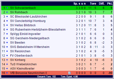 In der Tabelle der Landesliga Ost steht der SV Schwarzenbach mit neun Punkten aus drei Spielen vor dem SV Rohrbach an der Tabellenspitze. Der ASV Kleinottweiler ist als einziges Team noch ohne Punktegewinn: