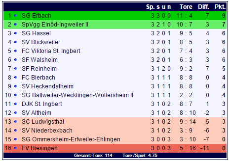 In der Tabelle der Bezirksliga Homburg steht die SG Erbach verlustpunktfrei ganz oben, die SG Ommersheim-Erfweiler-Ehlingen und der FV Biesingen sind das krasse Gegenstück und bleiben als einzige Teams der Liga punktlos.